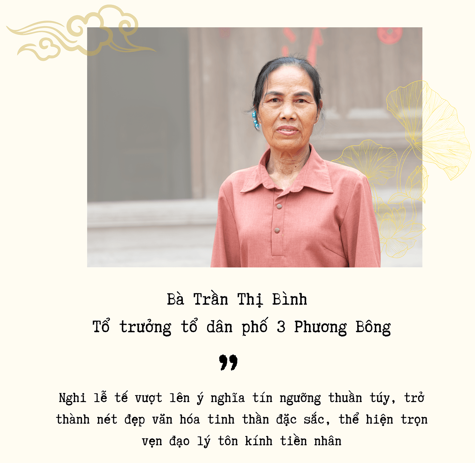 Bà Trần Thị Bình, Tổ trưởng Tổ dân phố 3 Phương Bông cho biết: Đội tế nữ quan Phương Bông thành lập cách đây 30 năm, thuộc nhóm đội tế ra đời sớm nhất của địa phương. Tổng số thành viên hiện tại là 22 người do bà Trần Thị Gái phụ trách. Các thành viên ở độ tuổi ngoài 60 và phải đáp ứng nhiều tiêu chuẩn khắt khe. Họ là những người có đạo đức, sức khỏe tốt. Gia đình hòa thuận, hạnh phúc, lối sống mẫu mực tại khu dân cư. Một trong các thử thách với các thành viên đội tế là sự bền bỉ, dẻo dai, bởi mỗi buổi tế thường kéo dài cả tiếng đồng hồ. Bằng sự kính ngưỡng các bậc tiền nhân, các thành viên trong đội đều nỗ lực thực hành các nghi thức chuẩn mực, nhịp nhàng.