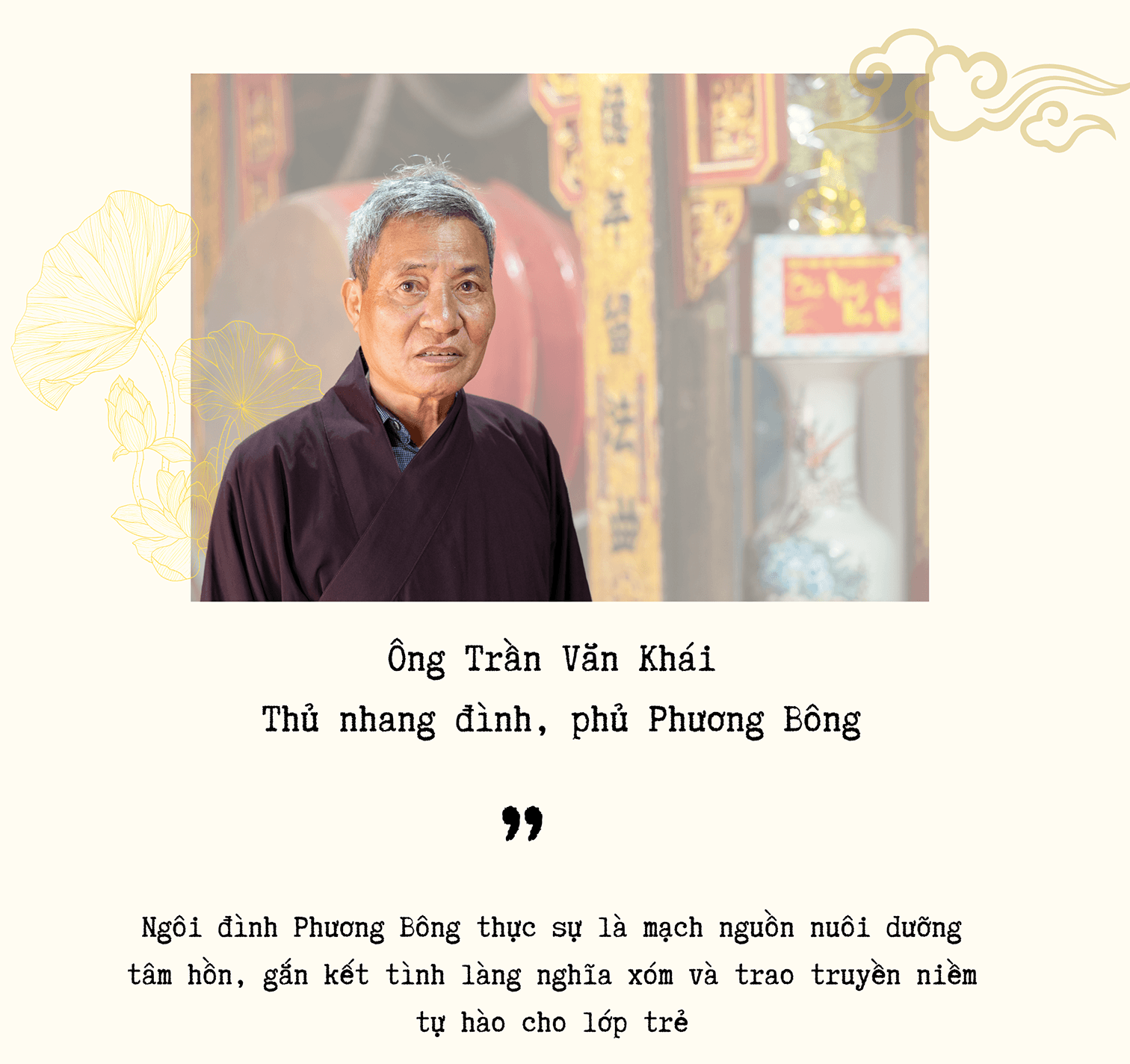 Ông Trần Văn Khái, Thủ nhang đình, phủ Phương Bông tự hào bộc bạch: “Thái sư Trần Quang Khải là bậc toàn tài. Ngài đem khúc hát khải hoàn truyền dạy cho dân chúng. Trải qua bao dâu bể, lớp lớp người dân Phương Bông luôn coi di sản của tiền nhân như báu vật. Ngôi đình cổ giờ đây không chỉ là nơi thờ tự linh thiêng. Nơi đây thực sự trở thành mạch nguồn nuôi dưỡng tâm hồn, gắn kết tình làng nghĩa xóm và trao truyền niềm tự hào cho lớp trẻ”.