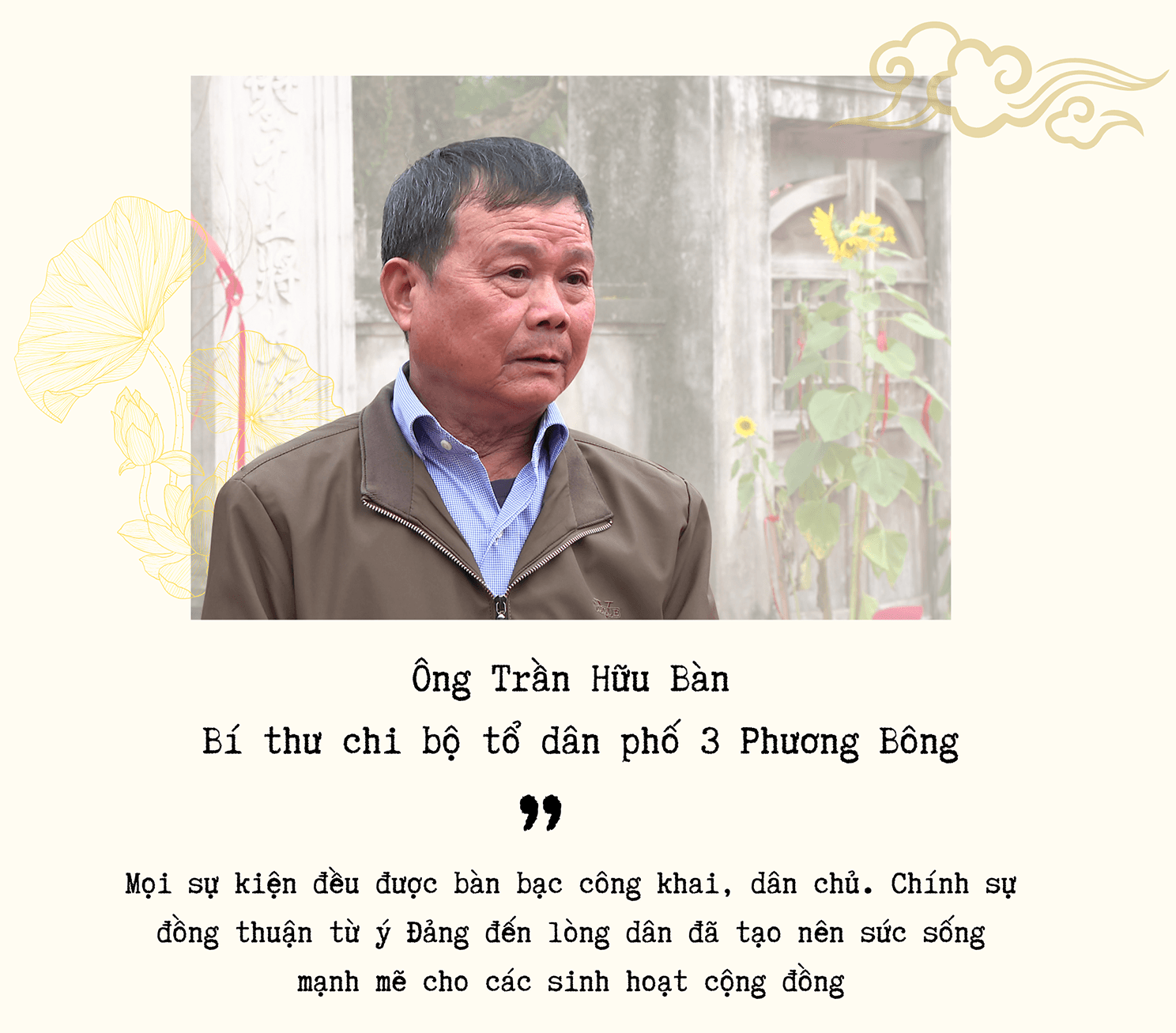 Để phong trào văn hóa quần chúng phát triển mạnh mẽ, yếu tố then chốt nằm ở sự đồng thuận giữa ý Đảng và lòng dân. Ông Trần Hữu Bàn, Bí thư chi bộ tổ dân phố 3 Phương Bông cho biết: “Cấp ủy, chính quyền địa phương luôn đặc biệt quan tâm chăm lo đời sống tinh thần của nhân dân. Địa phương chú trọng phát huy tinh thần đoàn kết trên tất cả các mặt công tác. Trước khi tổ chức các sự kiện văn hóa, chi bộ đều tổ chức họp dân, bàn bạc công khai, dân chủ. Sự đồng thuận tuyệt đối giữa ý Đảng và lòng dân tạo nên sức mạnh tổng hợp. Yếu tố này giúp các lễ hội, sinh hoạt cộng đồng luôn diễn ra an toàn, tiết kiệm”.