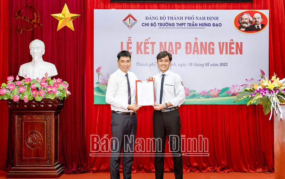 | Chi bộ Trường THPT Trần Hưng Đạo, Đảng bộ thành phố Nam Định tổ chức lễ kết nạp đảng viên cho học sinh Trần Đình Đức (Lớp 12, có thành tích xuất sắc trong học tập, rèn luyện năm học 2022-2023). |