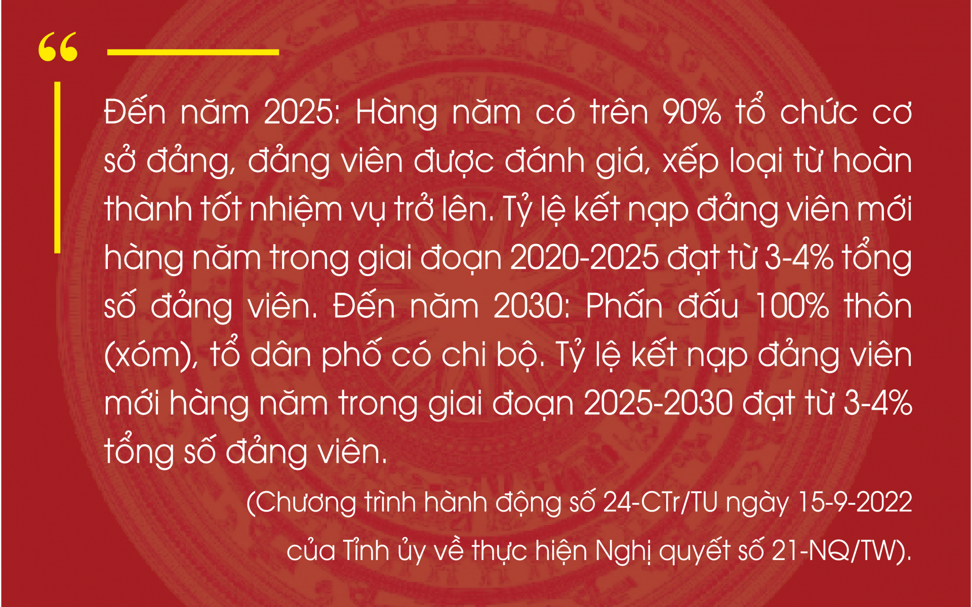 Quán triệt, triển khai thực hiện Nghị quyết số 21-NQ/TW, ngày 16-6-2022 của Ban Chấp hành Trung ương Đảng khóa XIII về “Tăng cường củng cố, xây dựng tổ chức cơ sở đảng và nâng cao chất lượng đội ngũ đảng viên trong giai đoạn mới”, Ban Chấp hành Đảng bộ tỉnh đã ban hành Chương trình hành động số 24-CTr/TU, ngày 15-9-2022 về thực hiện Nghị quyết số 21-NQ/TW; Thường trực Tỉnh ủy ban hành Công văn số 928-CV/TU ngày 2-2-2023 “Về việc triển khai thí điểm sinh hoạt đảng và công tác phát triển đảng viên”, giao chỉ tiêu và bồi dưỡng, tạo nguồn kết nạp đảng viên; thực hiện đúng phương châm, nguyên tắc, quy trình, thủ tục, thẩm quyền kết nạp đảng viên; kết hợp chặt chẽ giữa kết nạp đảng viên với quản lý, sàng lọc, kiên quyết đưa những đảng viên không đủ tư cách ra khỏi Đảng.