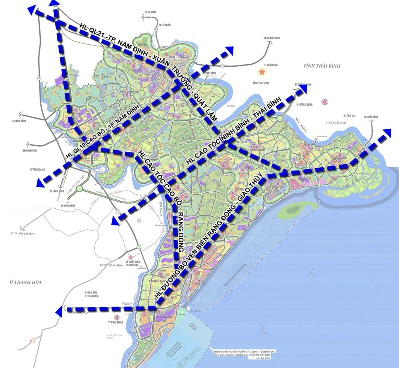 Còn lại, hạ tầng giao thông cụm hành lang Quốc lộ 21 và tuyến đường thành phố Nam Định - Xuân Trường - Giao Thủy (dự án xây dựng tuyến đường cao tốc Hà Nam - Nam Định (CT.11) tỉnh đang triển khai công tác chuẩn bị đầu tư; đây là hành lang có dân cư đông đúc, tổng vốn cơ sở vật chất lớn với các thị trấn là đô thị trung tâm các huyện nằm dọc theo đường Quốc lộ 21 với khoảng cách khá gần nhau (<10km), được="" xác="" định="" là="" hành="" lang="" phát="" triển="" động="" lực="" thứ="" cấp="" của="" nam="" định="" đến="" 2030="" và="" chủ="" đạo="" đến="" 2050.="" hạ="" tầng="" giao="" thông="" hành="" lang="" cao="" tốc="" ninh="" bình="" -="" nam="" định="" -="" thái="" bình="" -="" hải="" phòng="" (ct.08)="" đang="" được="" tỉnh="" triển="" khai="" công="" tác="" giải="" phóng="" mặt="" bằng;="" đây="" cũng="" là="" trục="" trung="" tâm,="" giúp="" kết="" nối="" thuận="" lợi="" với="" các="" tỉnh="" thái="" bình,="" ninh="" bình,="" hải="" phòng,="" quảng="" ninh="" và="" đi="" qua="" các="" thị="" trấn="" đang="" phát="" triển="" như="" thị="" trấn="" cổ="" lễ,="" thị="" trấn="" liễu="" đề,="" cũng="" là="" hành="" lang="" có="" vị="" trí="" quan="" trọng,="" có="" ảnh="" hưởng="" và="" đóng="" góp="" lớn="" cho="" sự="" phát="" triển="" kinh="" tế="" -="" xã="" hội="" của="" tỉnh="" nên="" được="" xác="" định="" là="" hành="" lang="" phát="" triển="" động="" lực="" thứ="" cấp="" đến="" 2030="" và="" chủ="" đạo="" đến="" 2050.="" trong="" vòng 2="" năm="" tới, hệ="" thống="" kết="" cấu="" hạ="" tầng="" giao="" thông="" đường="" bộ="" của="" tỉnh="" sẽ="" hoàn="" chỉnh="" mạng="" lưới="" đường="" cao="" tốc,="" thuận="" lợi kết="" nối="" với="" các="" khu="" vực="" kinh="" tế="" trọng="" điểm="" quốc="" gia="" như="" hà="" nội,="" hải="" phòng,="" tạo="" nhiều="" thuận="" lợi="" cho="" giao="" thông="" đi="" lại="" của="" người="" dân="" và="" các="" doanh="" nghiệp="" vận="" chuyển="" hàng="">