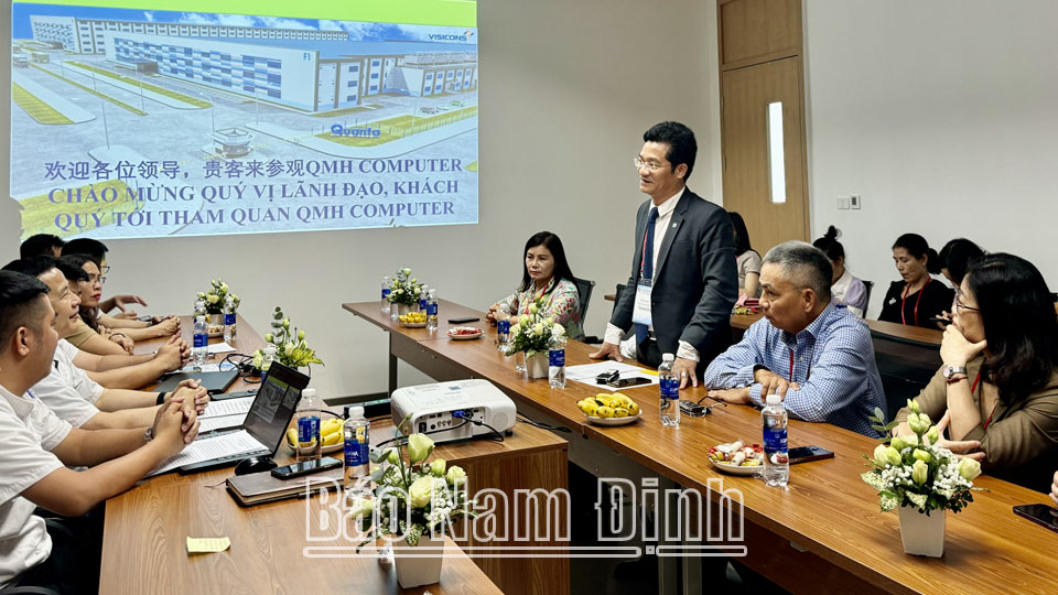 | Đồng chí Trần Anh Dũng, Ủy viên Ban TVTU, Phó Chủ tịch Thường trực UBND tỉnh, Tổ trưởng Tổ công tác 874 trực tiếp nắm bắt thực tế để kịp thời hỗ trợ Tập đoàn Quanta Computer Inc., thuận lợi nhất trong phát triển sản xuất, kinh doanh tại Nam Định. |