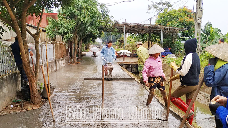| Nhân dân xóm Đông, thôn Cẩm, xã Yên Dương tổ chức đổ bê tông đường dong ngõ. |