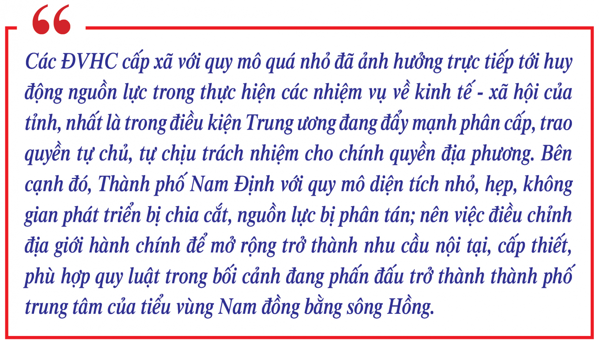 Các ĐVHC cấp xã với quy mô quá nhỏ đã ảnh hưởng trực tiếp tới huy động nguồn lực trong thực hiện các nhiệm vụ về kinh tế - xã hội của tỉnh, nhất là trong điều kiện Trung ương đang đẩy mạnh phân cấp, trao quyền tự chủ, tự chịu trách nhiệm cho chính quyền địa phương. Bên cạnh đó, Thành phố Nam Định với quy mô diện tích nhỏ, hẹp, không gian phát triển bị chia cắt, nguồn lực bị phân tán; nên việc điều chỉnh địa giới hành chính để mở rộng trở thành nhu cầu nội tại, cấp thiết, phù hợp quy luật trong bối cảnh đang phấn đấu trở thành thành phố trung tâm của tiểu vùng Nam đồng bằng sông Hồng.