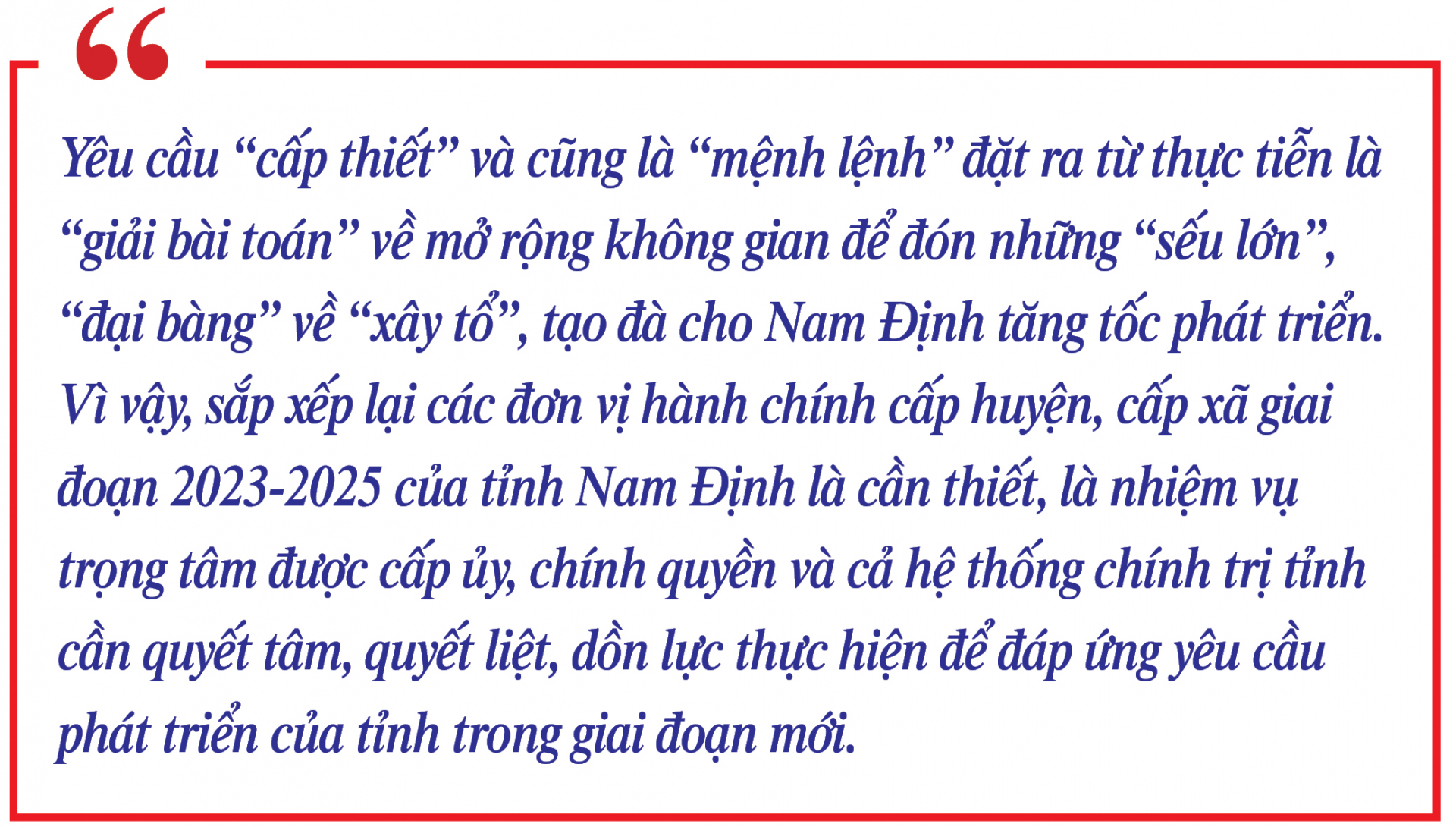 Yêu cầu “cấp thiết” và cũng là “mệnh lệnh” đặt ra từ thực tiễn là “giải bài toán” về mở rộng không gian để đón những “sếu lớn”, “đại bàng” về “xây tổ”, tạo đà cho Nam Định tăng tốc phát triển. Vì vậy, sắp xếp lại các đơn vị hành chính cấp huyện, cấp xã giai đoạn 2023-2025 của tỉnh Nam Định là cần thiết, là nhiệm vụ trọng tâm được cấp ủy, chính quyền và cả hệ thống chính trị tỉnh cần quyết tâm, quyết liệt, dồn lực thực hiện để đáp ứng yêu cầu phát triển của tỉnh trong giai đoạn mới.