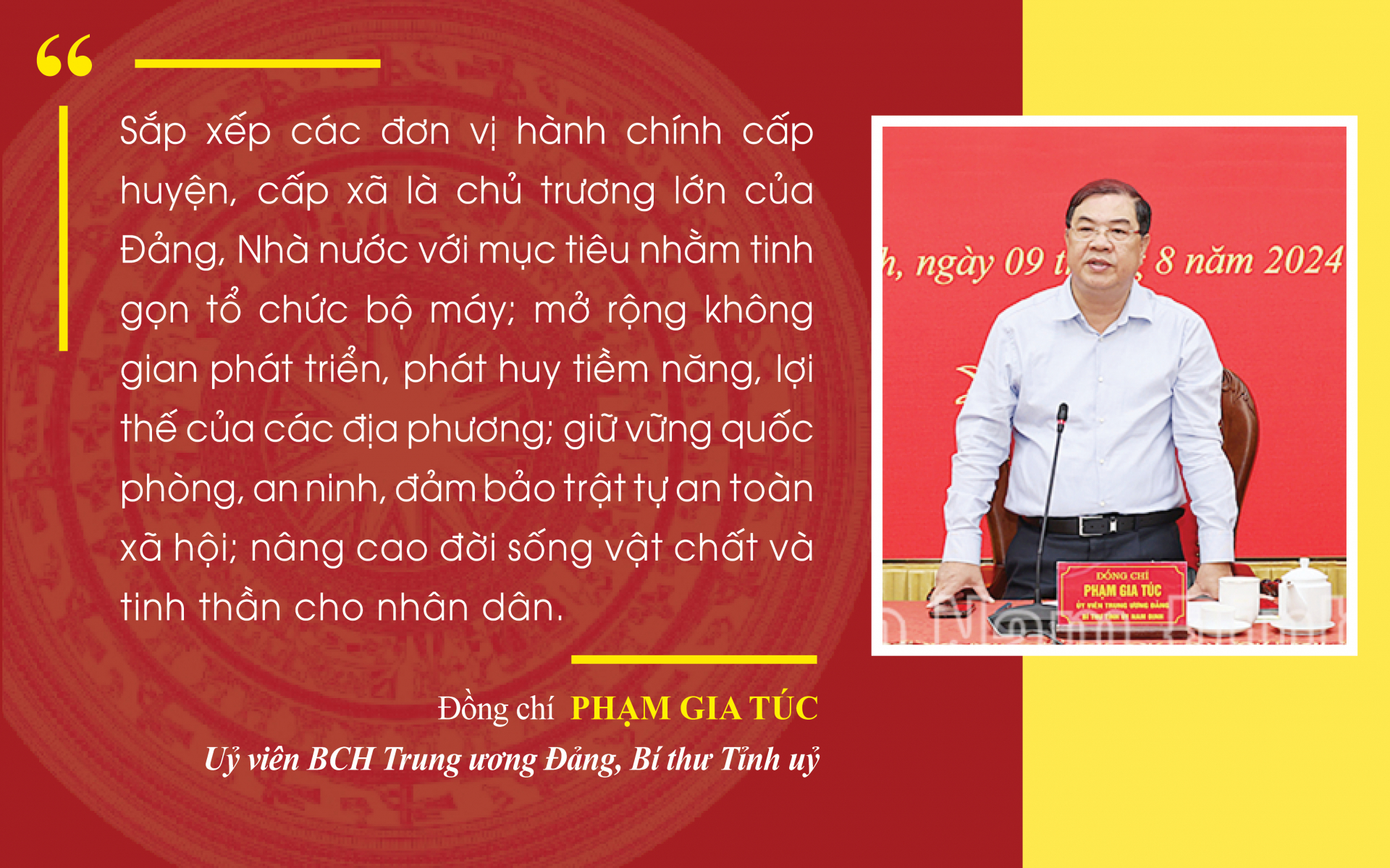 Đồng chí Phạm Gia Túc, Uỷ viên BCH Trung ương Đảng, Bí thư Tỉnh uỷ khẳng định: “Sắp xếp các ĐVHC cấp huyện, cấp xã là chủ trương lớn của Đảng, Nhà nước với mục tiêu nhằm tinh gọn tổ chức bộ máy; mở rộng không gian phát triển, phát huy tiềm năng, lợi thế của các địa phương; giữ vững quốc phòng, an ninh, đảm bảo trật tự an toàn xã hội; nâng cao đời sống vật chất và tinh thần cho nhân dân”.