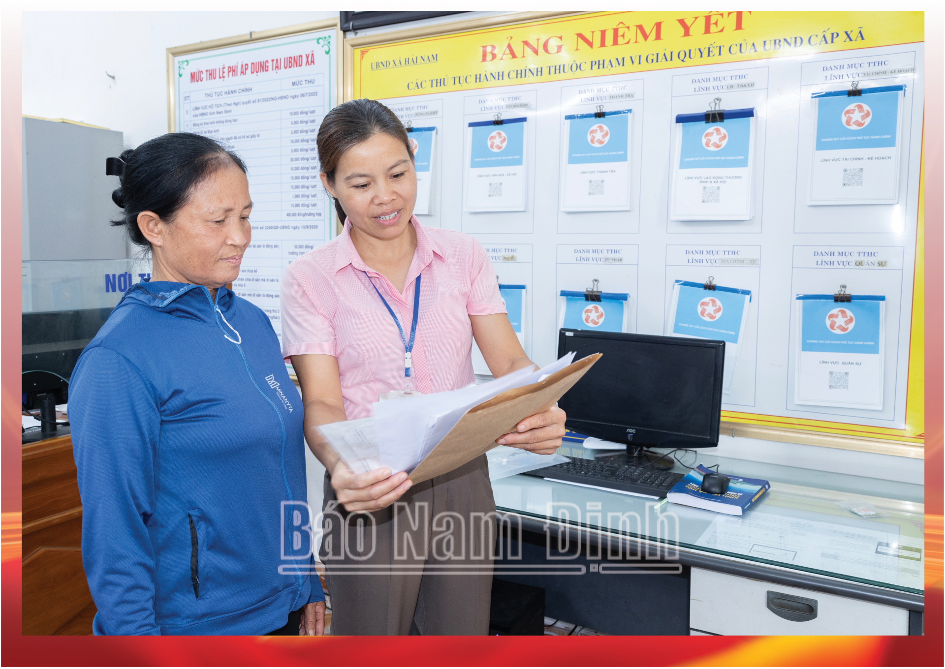 | Cán bộ xã Hải Nam (Hải Hậu) giải quyết thủ tục hành chính cho người dân. |