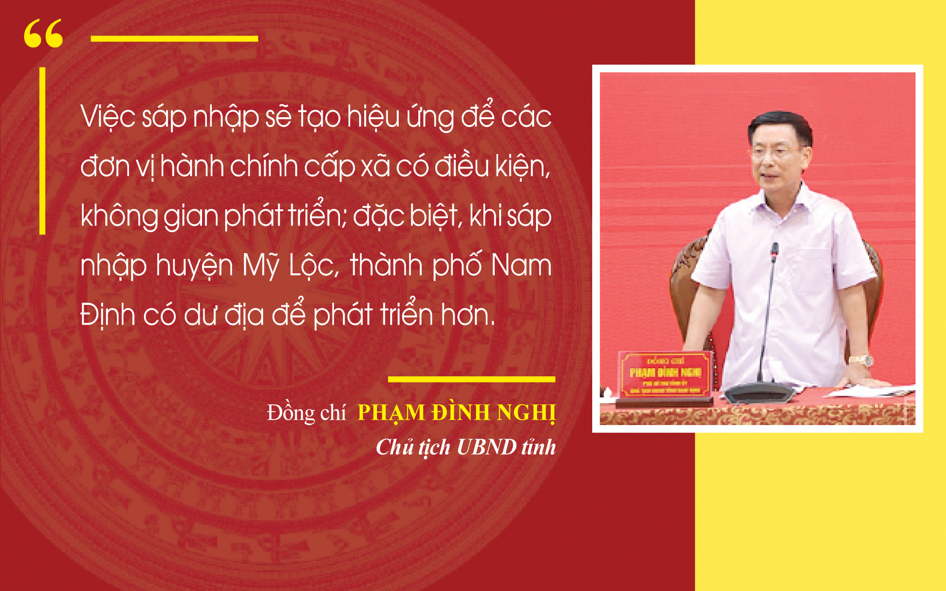 Sau sắp xếp ĐVHC, tỉnh Nam Định còn 9 đơn vị hành chính cấp huyện; 175 đơn vị hành chính cấp xã; qua đó giảm 1 đơn vị hành chính cấp huyện, 51 đơn vị hành chính cấp xã. Đồng chí Chủ tịch UBND tỉnh Phạm Đình Nghị khẳng định: “ Việc sáp nhập sẽ tạo hiệu ứng để các đơn vị hành chính cấp xã có điều kiện, không gian phát triển; đặc biệt, khi sáp nhập huyện Mỹ Lộc, thành phố Nam Định có dư địa để phát triển hơn ”. Theo đó, các ĐVHC mới sau sáp nhập đều có diện tích và quy mô dân số lớn hơn nhiều lần, hình thành nguồn quỹ đất dồi dào, tạo ra những mặt bằng đủ lớn để đón “đại bàng” trong lĩnh vực công nghệ cao, tạo giá trị gia tăng lớn. Đồng thời thúc đẩy liên kết nội vùng, liên kết vùng, phân công và hợp tác lãnh thổ, phát huy đầy đủ các tiềm năng, thế mạnh, lợi thế so sánh, bổ sung cho nhau cùng phát triển. Đó cũng chính là điều kiện “tiên quyết” để các địa phương trong tỉnh thu hút đầu tư, thúc đẩy, hiện thực hoá các quy hoạch tỉnh, quy hoạch nông thôn, quy hoạch đô thị và các quy hoạch khác có liên quan, đặc biệt là Quy hoạch tỉnh Nam Định thời kỳ 2021-2030, tầm nhìn đến năm 2050; mở ra không gian mới, định hình động lực và giải pháp tạo sức bật phát triển kinh tế - xã hội của tỉnh.
