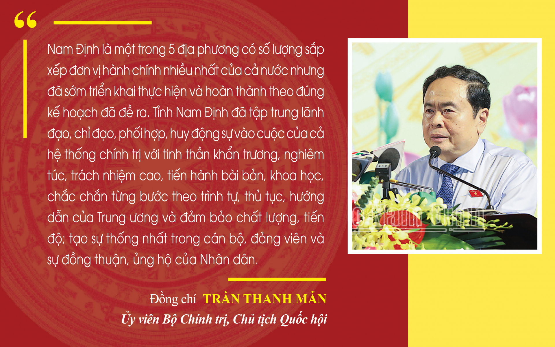 Với quyết tâm cao, nỗ lực lớn của cả hệ thống chính trị, sự đồng thuận của “Ý Đảng, lòng dân”, quá trình sắp xếp, sáp nhập đơn vị hành chính (ĐVHC) cấp huyện, cấp xã giai đoạn 2023 - 2025 của tỉnh Nam Định đã hoàn thành đúng tiến độ, đạt kết quả cao. Từ đó đã tạo động lực mới, mở ra không gian phát triển mới và phát huy nội lực, thúc đẩy kinh tế - xã hội của tỉnh có những bước đột phá, để Nam Định sớm trở thành tỉnh phát triển khá của cả nước.