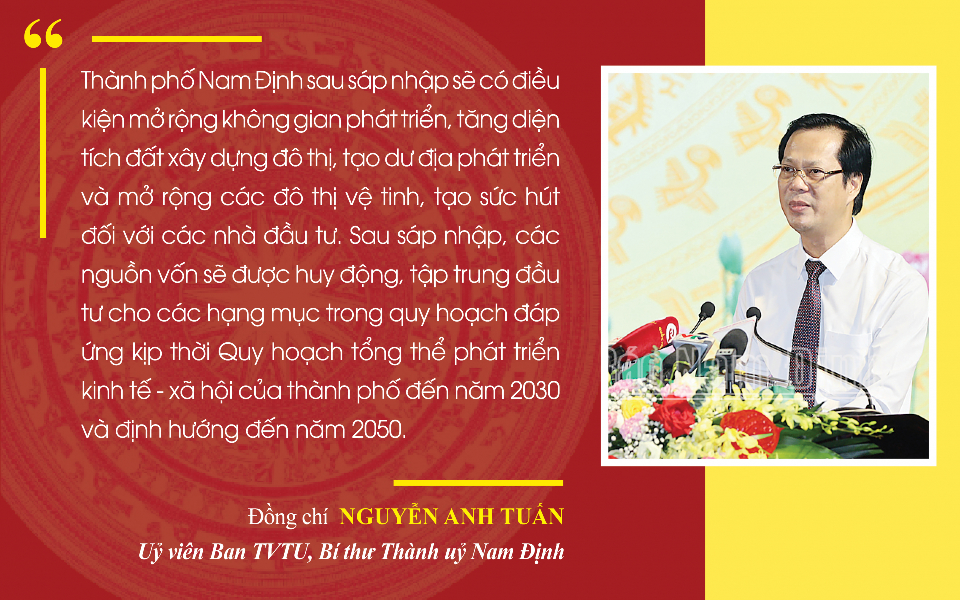 Sau sắp xếp, sáp nhập ĐVHC, thành phố Nam Định có diện tích tự nhiên 120,90 km2 và quy mô dân số là 364.181 người; có 21 ĐVHC cấp xã, gồm 14 phường và 7 xã (giảm 15 đơn vị). Đồng chí Nguyễn Anh Tuấn, Uỷ viên Ban TVTU, Bí thư Thành uỷ Nam Định cho biết: “Thành phố Nam Định sau sáp nhập sẽ có điều kiện mở rộng không gian phát triển, tăng diện tích đất xây dựng đô thị, tạo dư địa phát triển và mở rộng các đô thị vệ tinh, tạo sức hút đối với các nhà đầu tư. Sau sáp nhập, các nguồn vốn sẽ được huy động, tập trung đầu tư cho các hạng mục trong quy hoạch đáp ứng kịp thời Quy hoạch tổng thể phát triển kinh tế - xã hội của thành phố đến năm 2030 và định hướng đến năm 2050”.