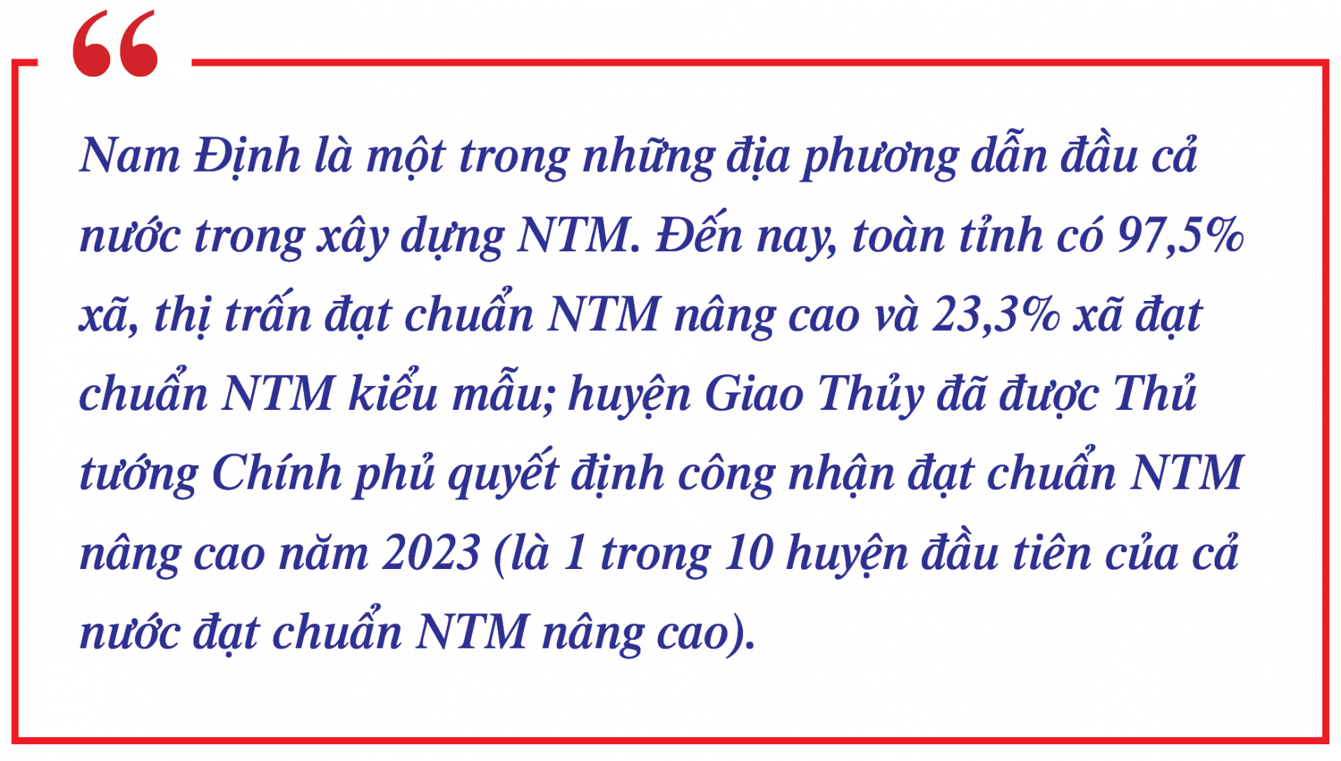 Thời gian qua, tỉnh cũng tập trung nguồn lực thực hiện Chương trình xây dựng nông thôn mới (NTM) với việc đẩy mạnh xây dựng NTM nâng cao, kiểu mẫu… góp phần tạo bước chuyển biến tích cực trong phát triển kinh tế - xã hội tỉnh. Nam Định là một trong những địa phương dẫn đầu cả nước trong xây dựng NTM. Đến nay, toàn tỉnh có 97,5% xã, thị trấn đạt chuẩn NTM nâng cao và 23,3% xã đạt chuẩn NTM kiểu mẫu; huyện Giao Thủy đã được Thủ tướng Chính phủ quyết định công nhận đạt chuẩn NTM nâng cao năm 2023 (là 1 trong 10 huyện đầu tiên của cả nước đạt chuẩn NTM nâng cao).