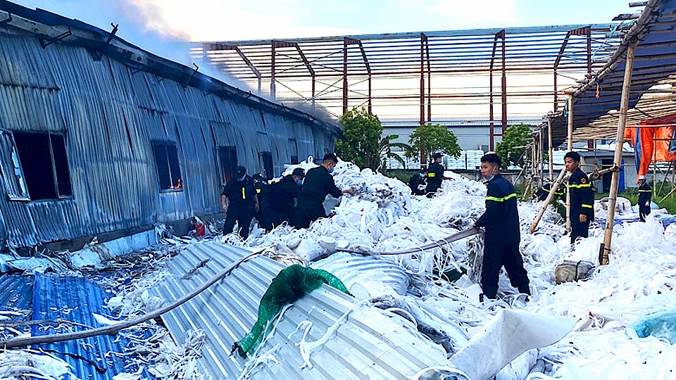 | Lực lượng PCCC và CNCH (Công an tỉnh) kiểm tra hiện trường sau vụ cháy khu nhà xưởng của Công ty TNHH Santerlon, Khu công nghiệp Hòa Xá, thành phố Nam Định. Ảnh: Hoàng Tuấn |