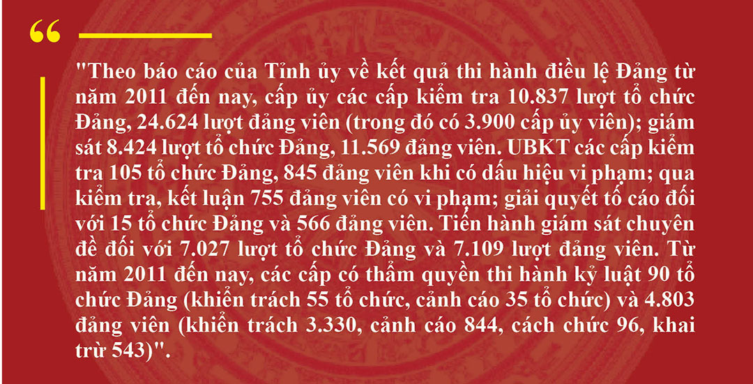 Từ kết quả và hiệu ứng tích cực của công tác kiểm tra, giám sát và thi hành kỷ luật Đảng thời gian qua trong việc củng cố, nâng cao năng lực, sức chiến đấu của tổ chức Đảng; Tỉnh ủy tiếp tục chỉ đạo quyết liệt triển khai thực hiện các quy định, kết luận của Trung ương về công tác xây dựng Đảng, nhất là Kết luận số 21-KL/TW của Ban Chấp hành Trung ương về xây dựng, chỉnh đốn Đảng và hệ thống chính trị; Quy định số 205-QĐ/TW của Bộ Chính trị về việc kiểm soát quyền lực trong công tác cán bộ và chống chạy chức, chạy quyền và các quy định về trách nhiệm nêu gương của cán bộ, đảng viên, tạo chuyển biến tích cực trong công tác xây dựng Đảng và hệ thống chính trị đảm bảo ngày càng trong sạch, vững mạnh.