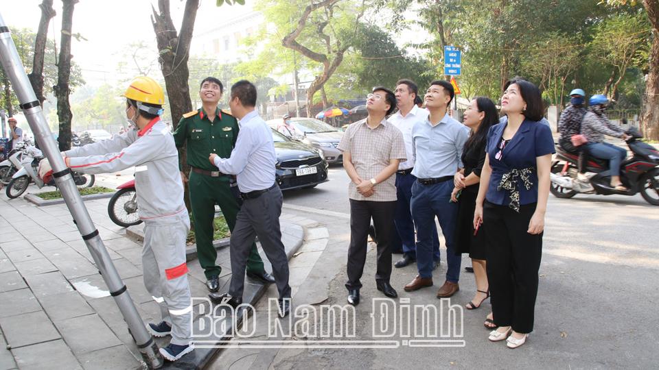 | Thường trực HĐND tỉnh khảo sát việc thanh thải dây cáp hết giá trị sử dụng trên tuyến phố Trần Hưng Đạo, phường Trần Hưng Đạo (Thành phố Nam Định). Ảnh Văn Trọng |