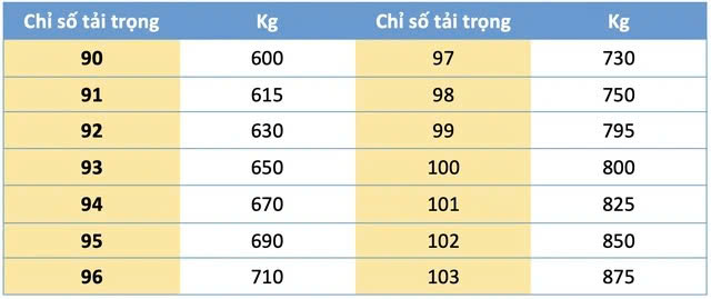 Chỉ số tải trọng (Load Index) thể hiện khối lượng tối đa lốp có thể chịu tải, ký hiệu bằng số từ 51 - 250. Đơn cử lốp xe Hyundai Santa Fe có chỉ số tải trọng 101, tương đương khả năng chịu tải 825 kg. Nếu dùng 4 lốp chỉ số này, tổng tải trọng tối đa đạt 3.300 kg.