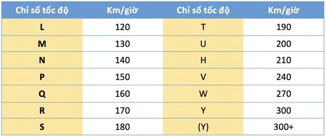 Những chỉ số tốc độ phổ biến trên lốp ô tô.