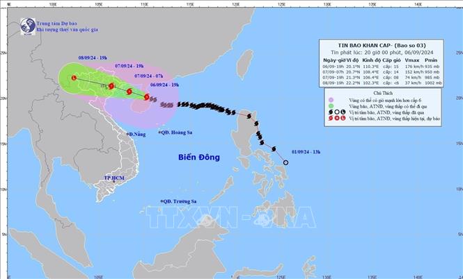 Trung tâm Dự báo khí tượng thủy văn Quốc gia, tối 6/9, bão số 3 đã giảm đi một cấp. Do ảnh hưởng của hoàn lưu bão số 3, tại đảo Bạch Long Vĩ có gió mạnh cấp 7, giật cấp 9. Lúc 19 giờ ngày 6/9, vị trí tâm bão số 3 ở vào khoảng 20,1 độ Vĩ Bắc; 110,3 độ Kinh Đông, trên vùng ven biển phía Bắc đảo Hải Nam (Trung Quốc); cách Quảng Ninh khoảng 360 km về phía Đông Đông Nam. Sức gió mạnh nhất vùng gần tâm bão mạnh cấp 15 (167 - 183 km/ giờ), giật trên cấp 17, di chuyển theo hướng Tây Tây Bắc, tốc độ 15 - 20 km/giờ.