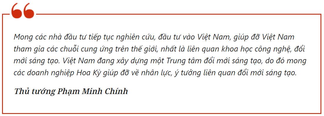 Thủ tướng mong với quan hệ hai nước đã thiết lập quan hệ Đối tác chiến lược toàn diện, các doanh nghiệp tiếp tục đầu tư mạnh mẽ vào Việt Nam; mong các nhà đầu tư tiếp tục nghiên cứu, đầu tư vào Việt Nam, giúp đỡ Việt Nam tham gia các chuỗi cung ứng trên thế giới, nhất là liên quan khoa học công nghệ, đổi mới sáng tạo. Việt Nam đang xây dựng một Trung tâm đổi mới sáng tạo, do đó mong các doanh nghiệp Hoa Kỳ giúp đỡ về nhân lực, ý tưởng liên quan đổi mới sáng tạo.