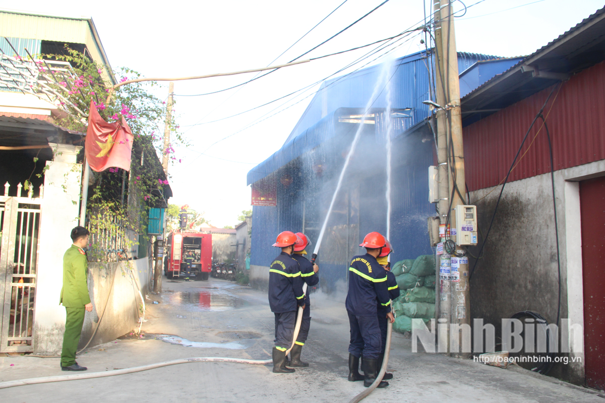 Ngay sau chương trình huấn luyện nghiệp vụ, Phòng Cảnh sát PCCC và CNCH phối hợp với Công ty TNHH Thùng gỗ Lạc Hồng tổ chức thực tập phương án chữa cháy và CNCH tại cơ sở. Theo tình huống giả định, đám cháy xảy ra tại xưởng sản xuất và chế biến gỗ trong khu vực làng nghề, với nhiều vật liệu dễ bắt lửa, nguy cơ cháy lan nhanh và phát sinh khói, khí độc.