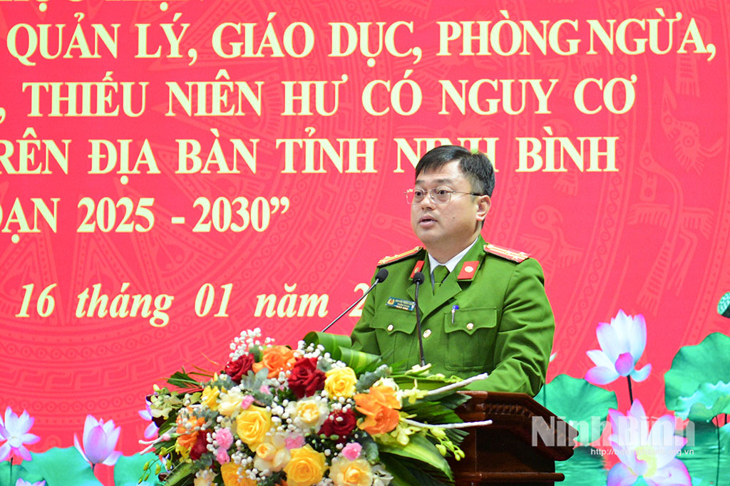 Thượng tá Nguyễn Trọng Dũng, Trưởng phòng Cảnh sát hình sự, Công an tỉnh trình bày Đề án “Tăng cường phối hợp quản lý, giáo dục, phòng ngừa, đấu tranh với thanh, thiếu niên hư có nguy cơ vi phạm pháp luật trên địa bàn tỉnh Ninh Bình, giai đoạn 2025 - 2030”.