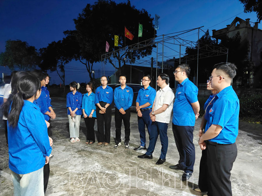 Bí thư Tỉnh đoàn Trần Ngọc Nam trò chuyện, động viên đoàn viên thanh niên tham gia làm nhiệm vụ tại Bình Lục.