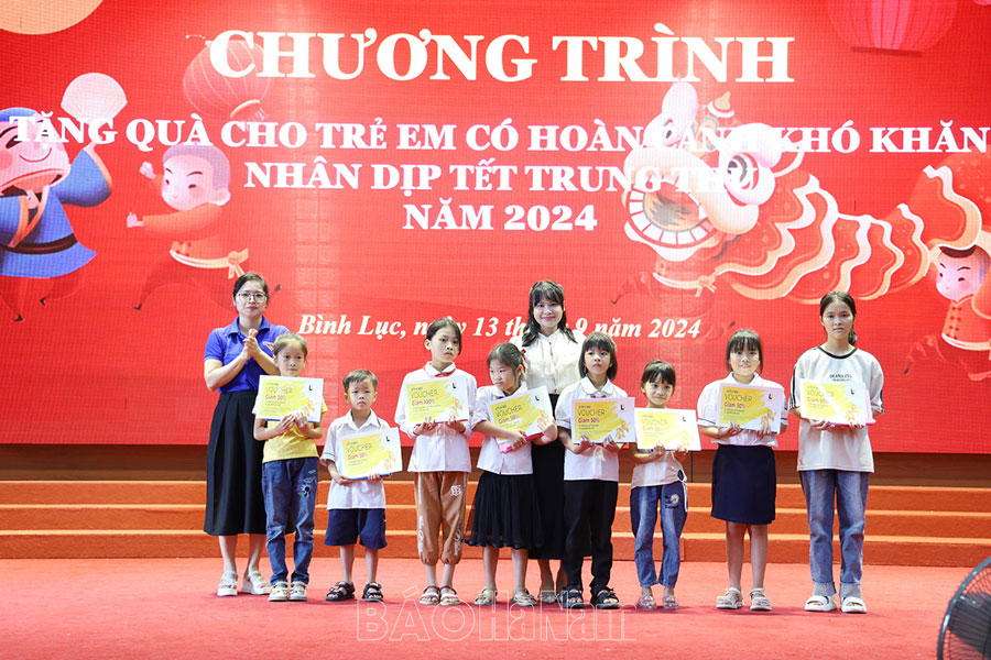 Chiều 13/9, Phòng Lao động, Thương binh và Xã hội (LĐ-TB&XH), Huyện đoàn và Nhà Thiếu nhi huyện Bình Lục phối hợp tổ chức chương trình tặng quà cho trẻ em có hoàn cảnh khó khăn nhân dịp Tết Trung thu năm 2024. Dự chương trình có đại diện lãnh đạo huyện Bình Lục, Huyện đoàn, Phòng LĐ-TB&XH huyện, một số nhà tài trợ; cán bộ đoàn, cán bộ LĐ-TB&XH các xã, thị trấn cùng các bậc phụ huynh và trẻ em được nhận quà.