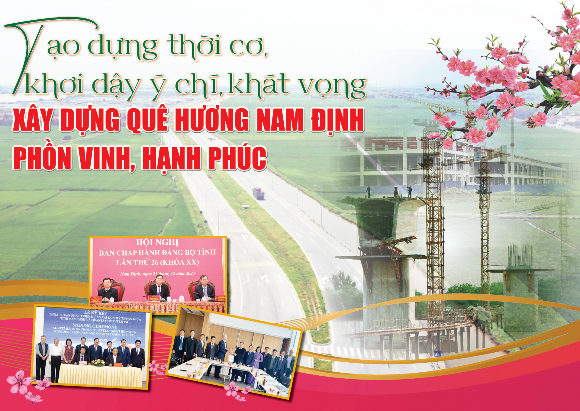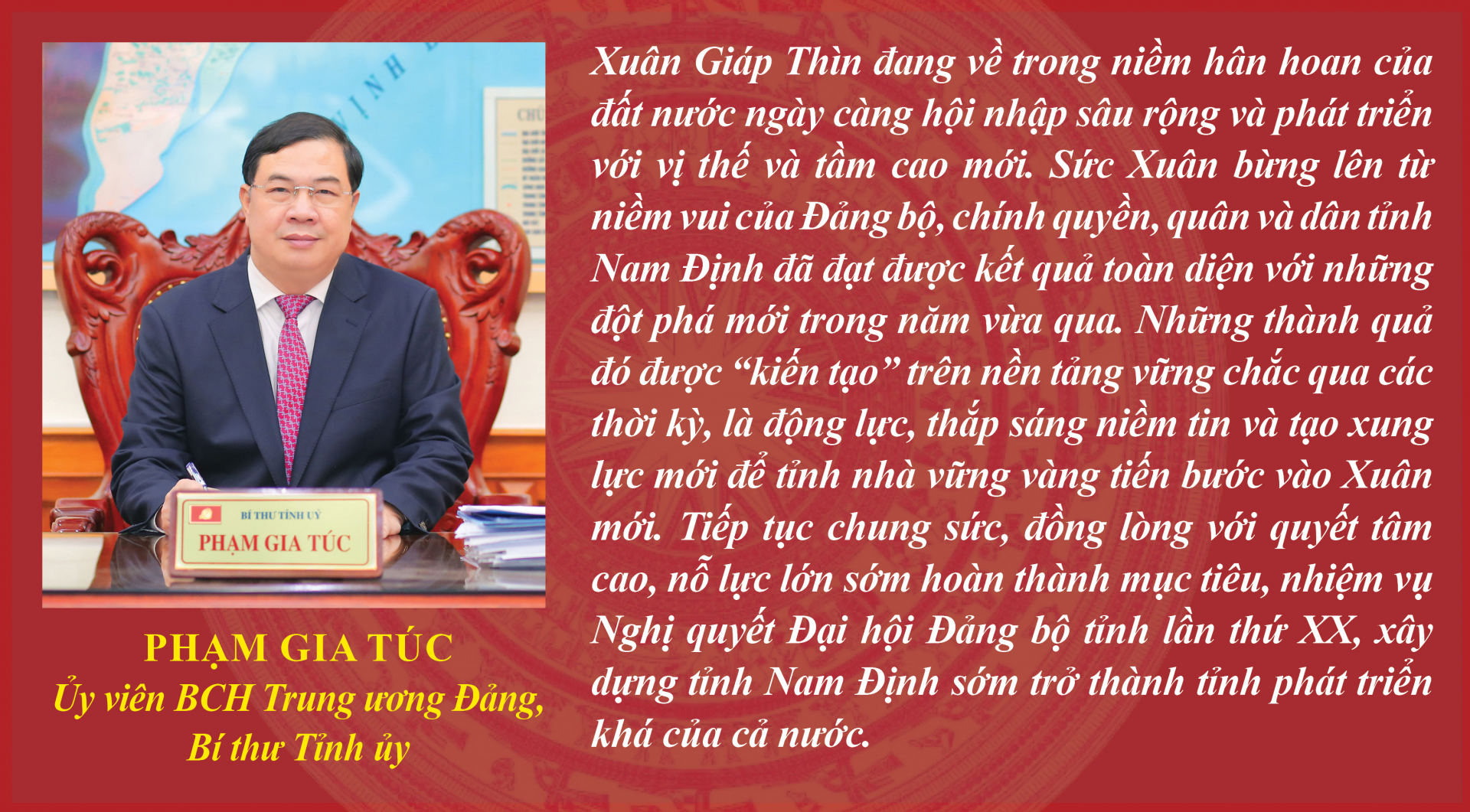 Bước vào mùa Xuân mới với khát vọng vươn lên mạnh mẽ, tràn đầy niềm tin về những vận hội mới và những thành tựu to lớn hơn nữa. Từ điểm tựa, từ động lực là những thành quả của nhiều nhiệm kỳ qua, Đảng bộ, chính quyền, quân và dân tỉnh Nam Định tiếp tục chung sức, đồng lòng, phát huy tinh thần đoàn kết, sáng tạo, quyết tâm, vững vàng vượt qua những khó khăn, thách thức, để tiếp tục có những thành tựu mới và tạo bước đột phá mới trong phát triển kinh tế - xã hội, xây dựng tỉnh Nam Định ngày càng phát triển nhanh và bền vững.