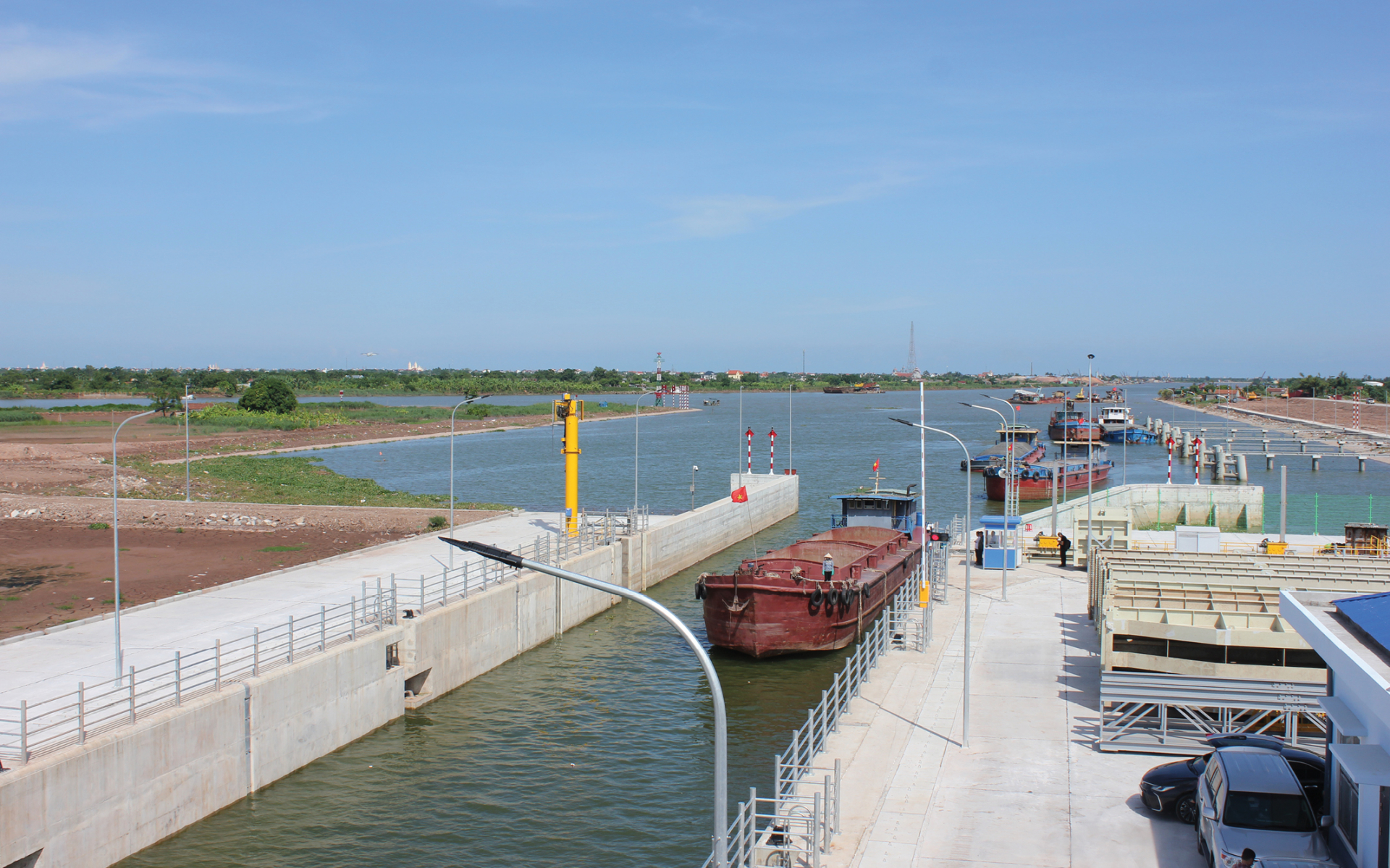 | Cụm công trình Kênh, Âu tàu Nghĩa Hưng với tổng mức đầu tư hơn 100 triệu USD hoàn thành và đưa vào khai thác tháng 7-2023. Ảnh: Thành Trung |