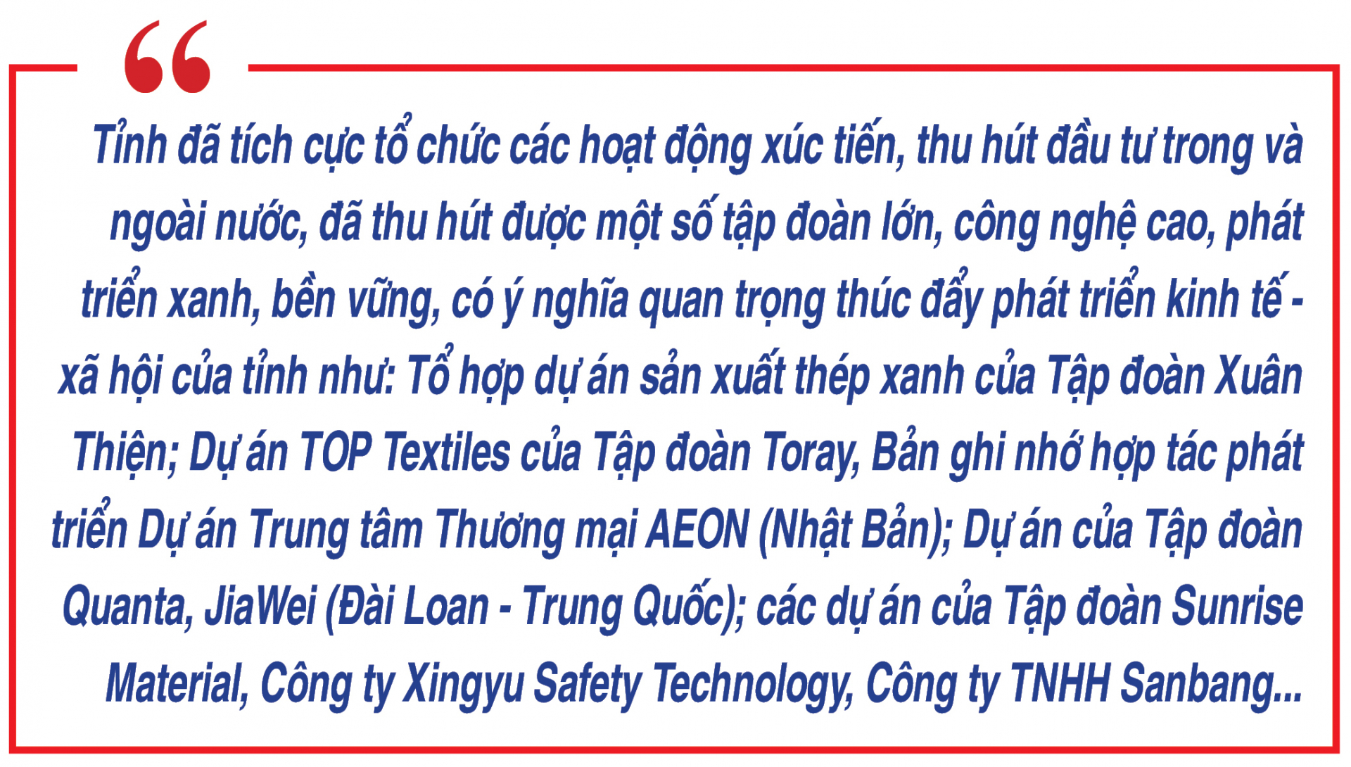 Công tác cải cách hành chính, xây dựng chính quyền điện tử, chuyển đổi số, xúc tiến và thu hút đầu tư được tập trung chỉ đạo quyết liệt, hiệu quả với những đột phá mới. Tỉnh đã tích cực tổ chức các hoạt động xúc tiến, thu hút đầu tư trong và ngoài nước, đã thu hút được một số tập đoàn lớn, công nghệ cao, phát triển xanh, bền vững, có ý nghĩa quan trọng thúc đẩy phát triển kinh tế - xã hội của tỉnh như: Tổ hợp dự án sản xuất thép xanh của Tập đoàn Xuân Thiện; Dự án TOP Textiles của Tập đoàn Toray, Bản ghi nhớ hợp tác phát triển Dự án Trung tâm Thương mại AEON (Nhật Bản); Dự án của Tập đoàn Quanta, JiaWei (Đài Loan - Trung Quốc); các dự án của Tập đoàn Sunrise Material, Công ty Xingyu Safety Technology, Công ty TNHH Sanbang... với tổng vốn đầu tư trên 630 triệu USD; thỏa thuận hợp tác với Công ty Liên doanh TNHH Khu công nghiệp Việt Nam - Singapore (VSIP) đầu tư tại Khu công nghiệp Hải Long...
