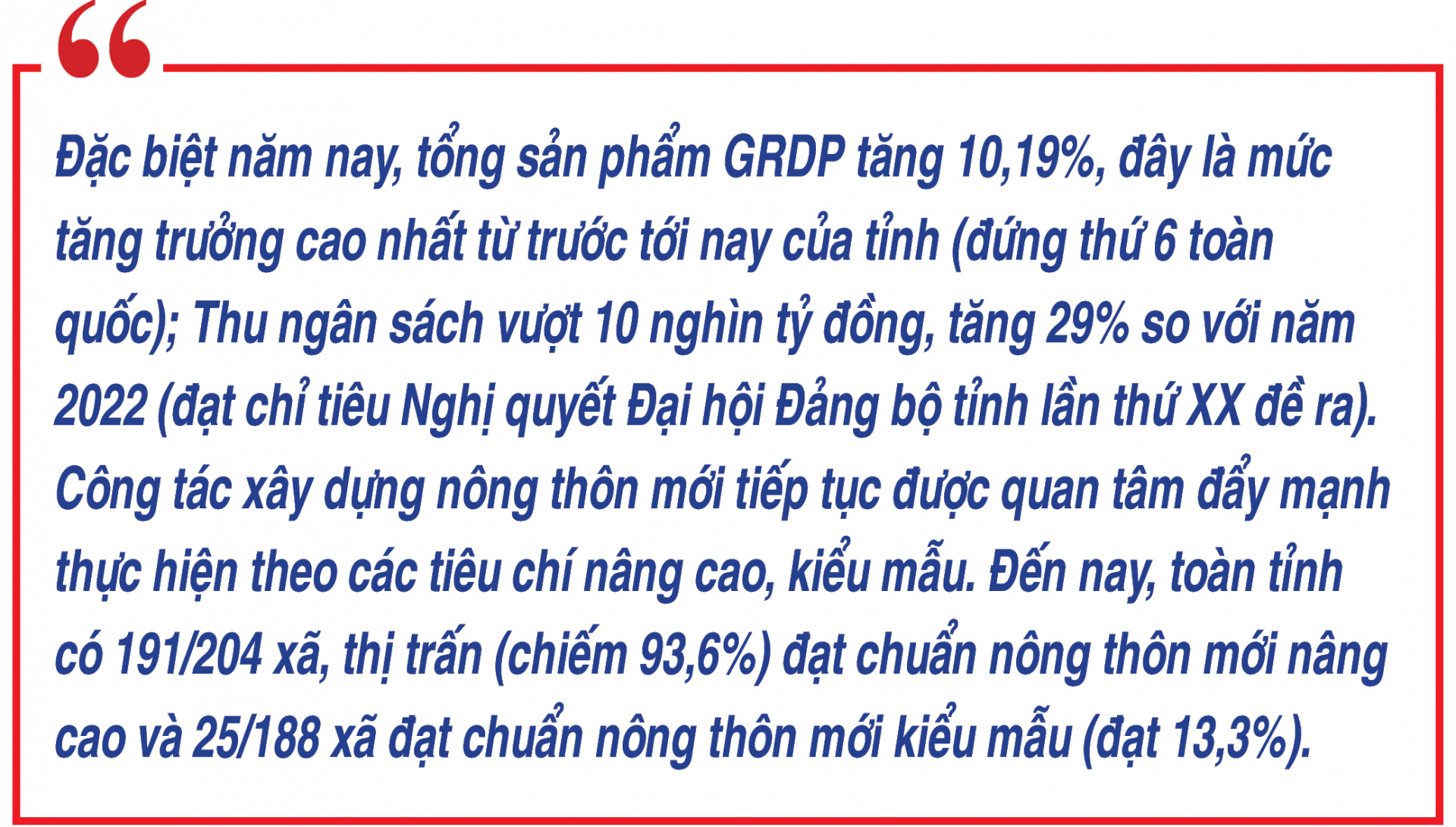 V ới sự quyết liệt trong công tác lãnh đạo, chỉ đạo của cấp ủy, chính quyền các cấp và sự quyết tâm, đồng lòng của cả hệ thống chính trị và các tầng lớp Nhân dân, tỉnh Nam Định đã hoàn thành ở mức cao nhất các mục tiêu, nhiệm vụ phát triển kinh tế - xã hội năm 2023, với những kết quả quan trọng: Hầu hết các chỉ tiêu đều đạt và vượt kế hoạch đề ra. Đặc biệt năm nay, tổng sản phẩm GRDP tăng 10,19%, đây là mức tăng trưởng cao nhất từ trước tới nay của tỉnh (đứng thứ 6 toàn quốc); Thu ngân sách vượt 10 nghìn tỷ đồng, tăng 29% so với năm 2022 (đạt chỉ tiêu Nghị quyết Đại hội Đảng bộ tỉnh lần thứ XX đề ra). Công tác xây dựng nông thôn mới tiếp tục được quan tâm đẩy mạnh thực hiện theo các tiêu chí nâng cao, kiểu mẫu. Đến nay, toàn tỉnh có 191/204 xã, thị trấn (chiếm 93,6%) đạt chuẩn nông thôn mới nâng cao và 25/188 xã đạt chuẩn nông thôn mới kiểu mẫu (đạt 13,3%).