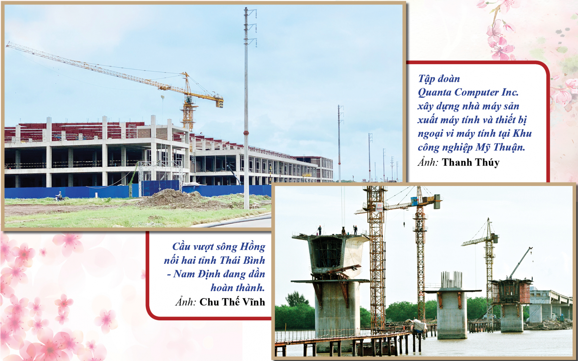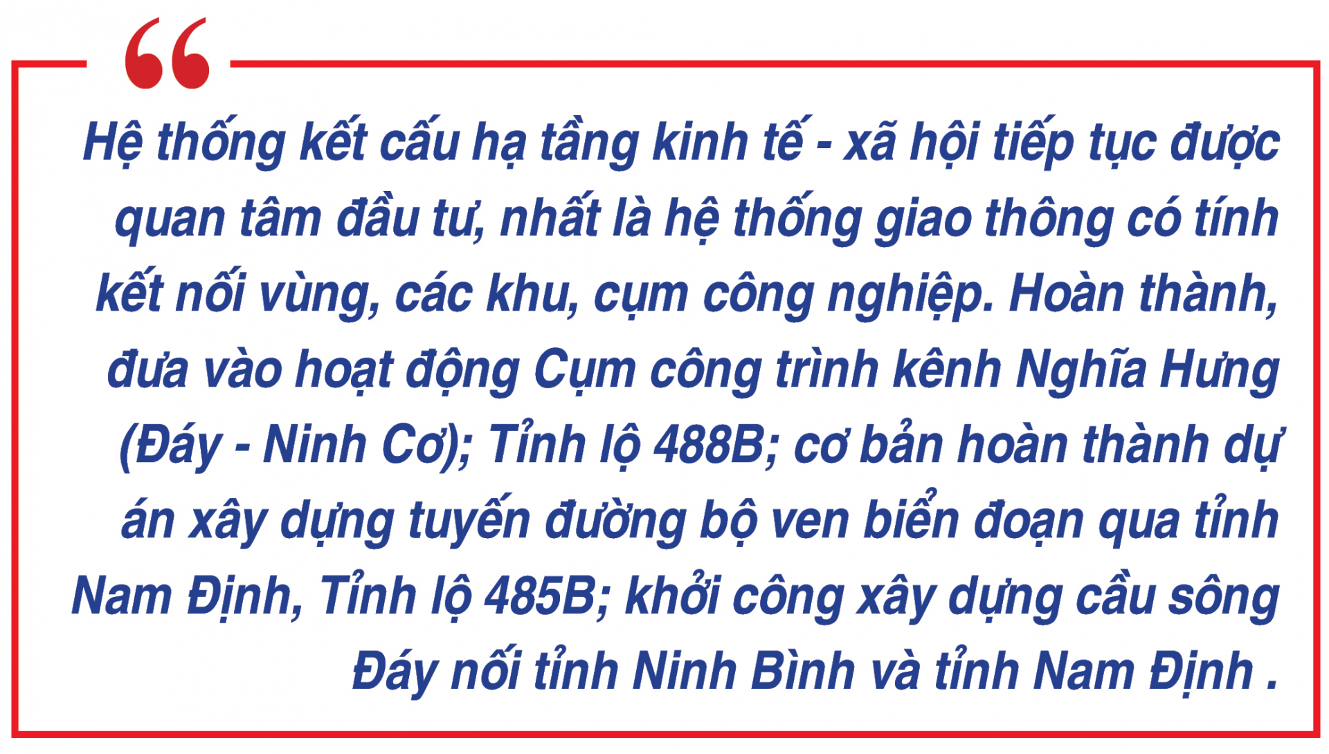 Hệ thống kết cấu hạ tầng kinh tế - xã hội tiếp tục được quan tâm đầu tư, nhất là hệ thống giao thông có tính kết nối vùng, các khu, cụm công nghiệp. Hoàn thành, đưa vào hoạt động Cụm công trình kênh Nghĩa Hưng (Đáy - Ninh Cơ); Tỉnh lộ 488B; cơ bản hoàn thành dự án xây dựng tuyến đường bộ ven biển đoạn qua tỉnh Nam Định, Tỉnh lộ 485B; khởi công xây dựng cầu sông Đáy nối tỉnh Ninh Bình và tỉnh Nam Định (thuộc tuyến cao tốc Ninh Bình - Nam Định - Thái Bình - Hải Phòng). Chỉ đạo đẩy nhanh tiến độ thi công, bàn giao mặt bằng, thực hiện thủ tục các dự án trọng điểm của tỉnh: Giai đoạn II dự án Xây dựng tuyến đường trục phát triển nối vùng kinh tế biển tỉnh Nam Định với đường cao tốc Cầu Giẽ - Ninh Bình (Tỉnh lộ 490); Tuyến đường bộ mới Nam Định - Lạc Quần - Đường bộ ven biển (Tỉnh lộ 484); Khu Trung tâm lễ hội thuộc Khu di tích lịch sử - văn hóa thời Trần (giai đoạn II); Bệnh viện Đa khoa tỉnh; các dự án thuộc Chương trình phục hồi và phát triển kinh tế - xã hội; hạ tầng khu đô thị, khu dân cư tập trung, khu tái định cư của các huyện, thành phố;... Phối hợp với Bộ Giao thông Vận tải đẩy nhanh tiến độ xây dựng cầu Bến Mới; chuẩn bị các điều kiện để khởi công xây dựng cầu Ninh Cường, cầu Đống Cao 2.