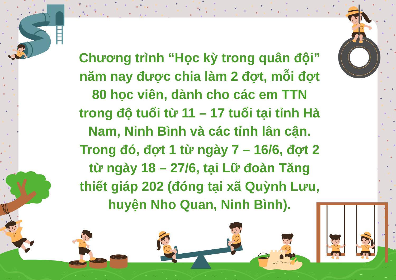 Chương trình “Học kỳ trong quân đội” năm nay được chia làm 2 đợt, mỗi đợt 80 học viên, dành cho các em TTN trong độ tuổi từ 11 – 17 tuổi tại tỉnh Hà Nam, Ninh Bình và các tỉnh lân cận. Trong đó, đợt 1 từ ngày 7 – 16/6, đợt 2 từ ngày 18 – 27/6, tại Lữ đoàn Tăng thiết giáp 202 (đóng tại xã Quỳnh Lưu, huyện Nho Quan, Ninh Bình). Tham gia khóa học, các em được học làm chiến sỹ; tham quan các di tích lịch sử, truyền thống của tỉnh Ninh Bình, của lực lượng vũ trang nhân dân; tham gia các hoạt động đền ơn đáp nghĩa, an sinh xã hội, các hoạt động xã hội, tình nguyện, bảo vệ môi trường và giao lưu với các chiến sỹ quân đội. Bên cạnh đó, được tham gia hoạt động khám phá bản thân, rèn luyện kỹ năng giao tiếp ứng xử, kỹ năng làm việc nhóm, tham gia các hoạt động tập thể; trang bị các kiến thức về giới tính, phòng tránh tai nạn thương tích, xâm hại tình dục; những bài học về tình yêu thương gia đình…