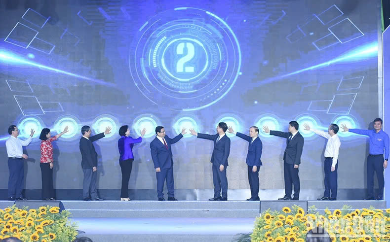 Tại buổi lễ, Thủ tướng Phạm Minh Chính và các đồng chí lãnh đạo đã thực hiện nghi thức phát động phong trào “Cả nước thi đua đổi mới sáng tạo và chuyển đổi số”.