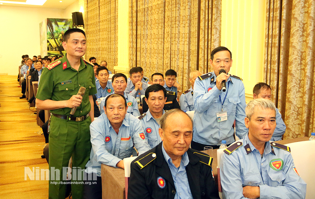 Cán bộ, người lao động và lực lượng bảo vệ của Agribank Chi nhánh Ninh Bình và Agribank Chi nhánh Nam Ninh Bình tham gia trao đổi một số tình huống tại hội nghị tập huấn.