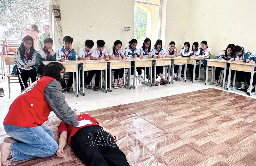 Học sinh Trường THCS Duy Hải (thị xã Duy Tiên) được tập huấn sơ cấp cứu ban đầu.