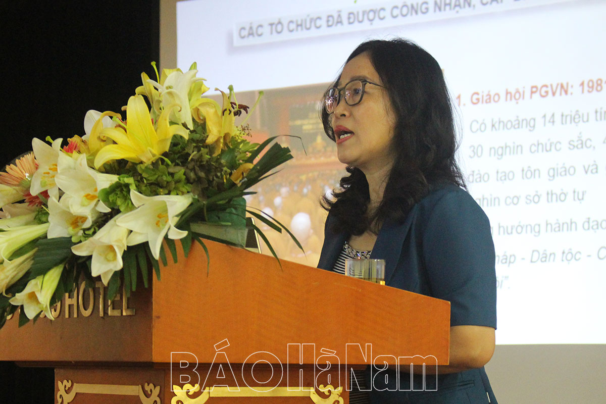 Tiến sỹ Trần Thị Minh Thu - Vụ trưởng Vụ Tín ngưỡng và các tôn giáo khác, Ban Tôn giáo Chính phủ, giảng viên lớp tập huấn.