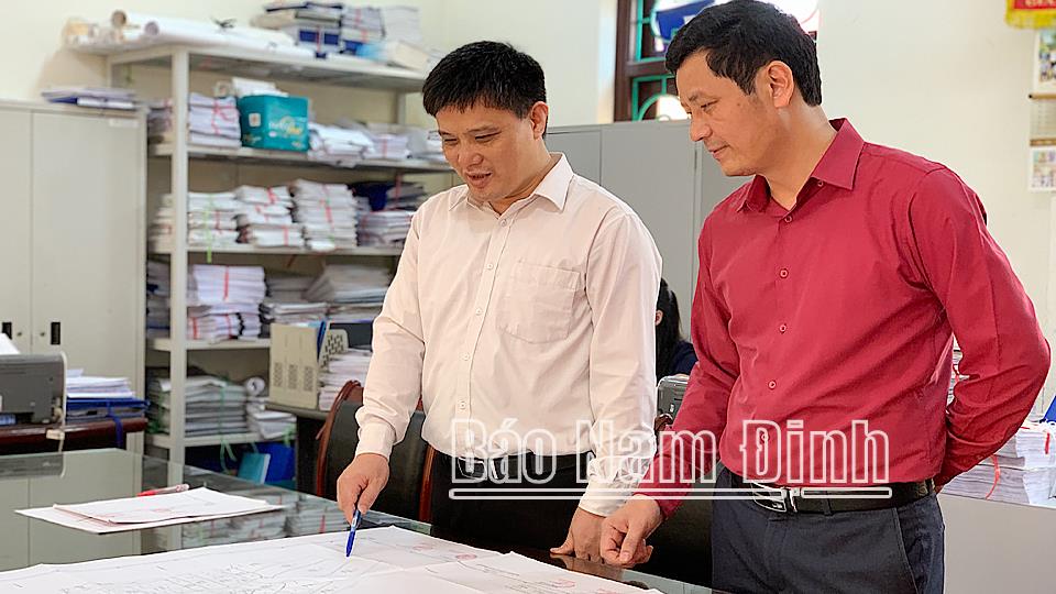 | Lãnh đạo UBND huyện, Phòng Tài nguyên và Môi trường huyện Nghĩa Hưng rà soát phần diện tích cần tập trung giải phóng mặt bằng phục vụ thi công các dự án của Tập đoàn Xuân Thiện. |