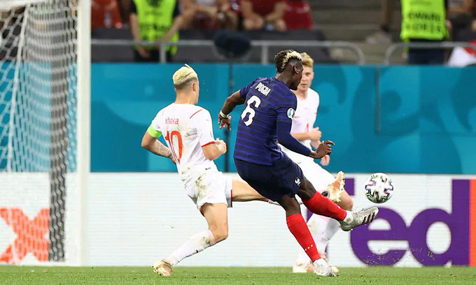 Pogba chơi nổi bật và ổn định nhất bên phía Pháp từ đầu giải, lên tiếng với với bàn nâng tỷ số lên 3-1. Nhận bóng từ ngoài cấm địa, khoảng 25 mét, Pogba cứa lòng về góc cao chữ A. Thủ môn Sommer bay người hết tầm với nhưng không chạm được vào bóng. Bàn đầu của tiền vệ Man Utd tại Euro 2021.