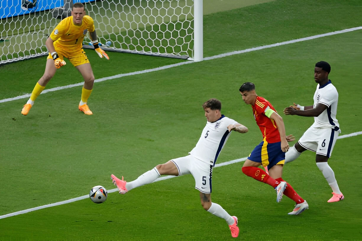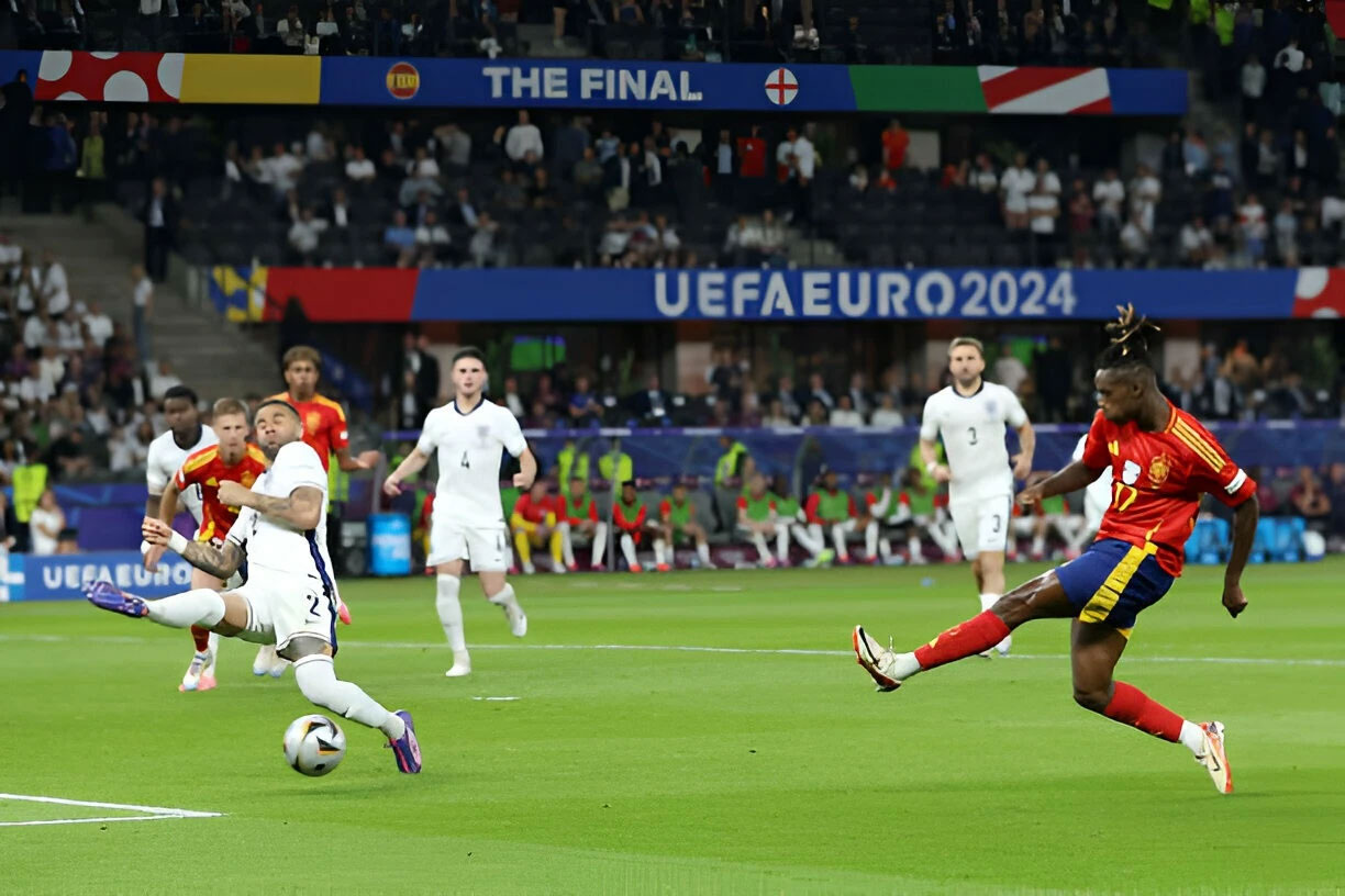Sau hiệp một thi đấu tốt, bộ đôi hậu vệ cánh của Anh bất ngờ mắc lỗi. Shaw để xổng Yamal bên cánh trái. Sao trẻ 17 tuổi đột phá vào trung lộ rồi chuyền ngang để Nico Williams sút chéo góc, tung lưới tuyển Anh. Ở pha bóng này, Walker cũng mắc lỗi kèm người.