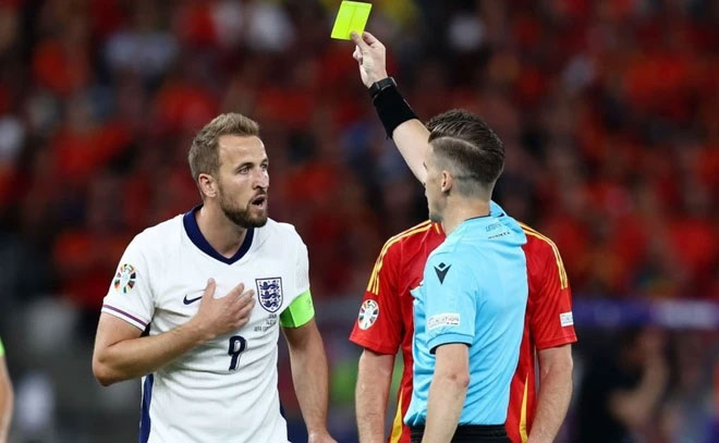 Phút 26, thẻ vàng đầu tiên của chung kết EURO được rút ra dành cho Kane. Tiền đạo người Anh vào trúng bóng nhưng không kịp thu chân, dẫn đến cú đạp vào vùng ống đồng của Fabian Ruiz. Đến phút 30, Dani Olmo cũng chịu án phạt tương tự sau pha phạm lỗi với Rice.