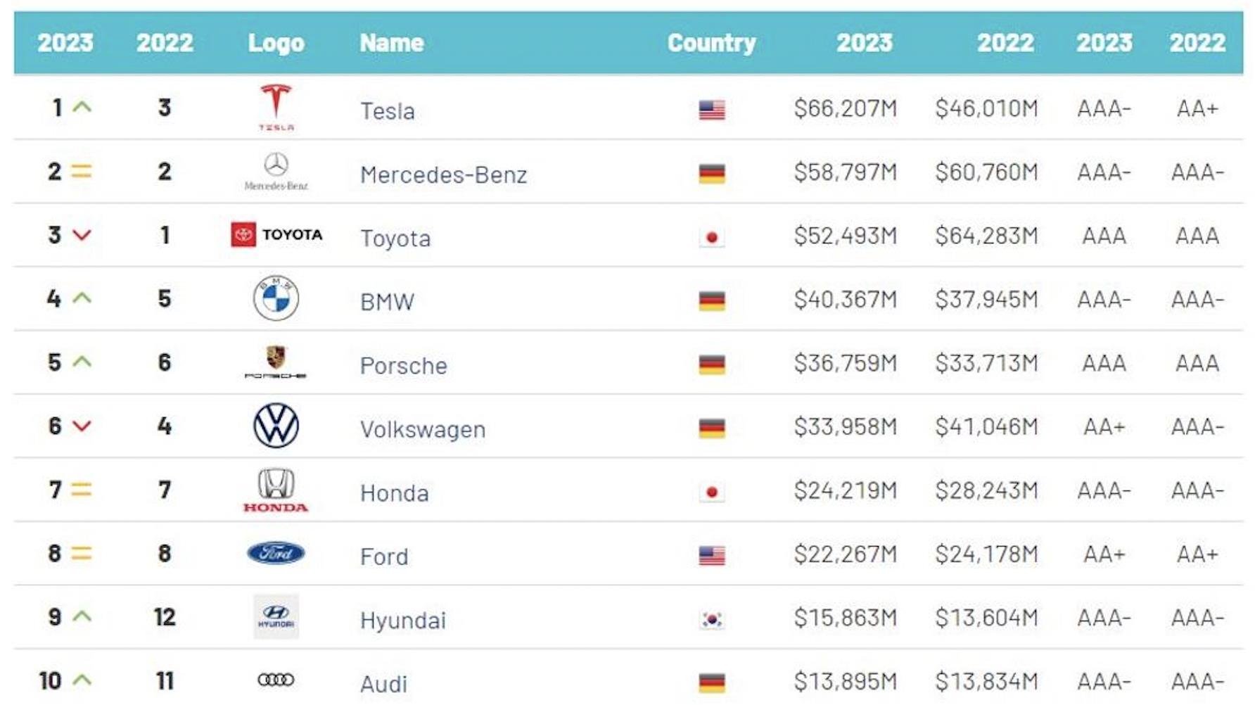 Bảng xếp hạng Top 10 thương hiệu ô tô giá trị nhất toàn cầu.