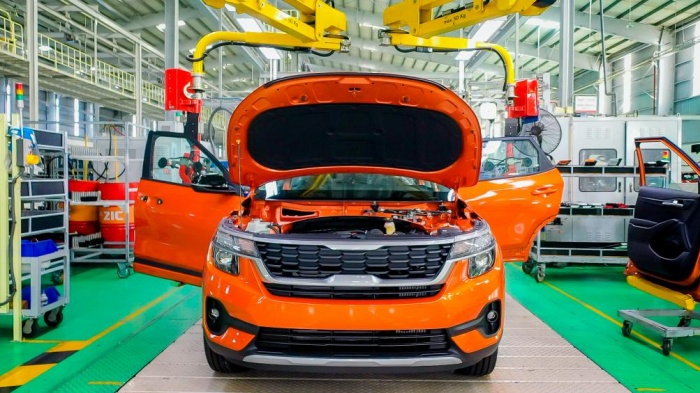 Một trong những dây chuyền hoàn thiện xe Kia SeltosDây chuyền hàn bấm xe Kia Seltos