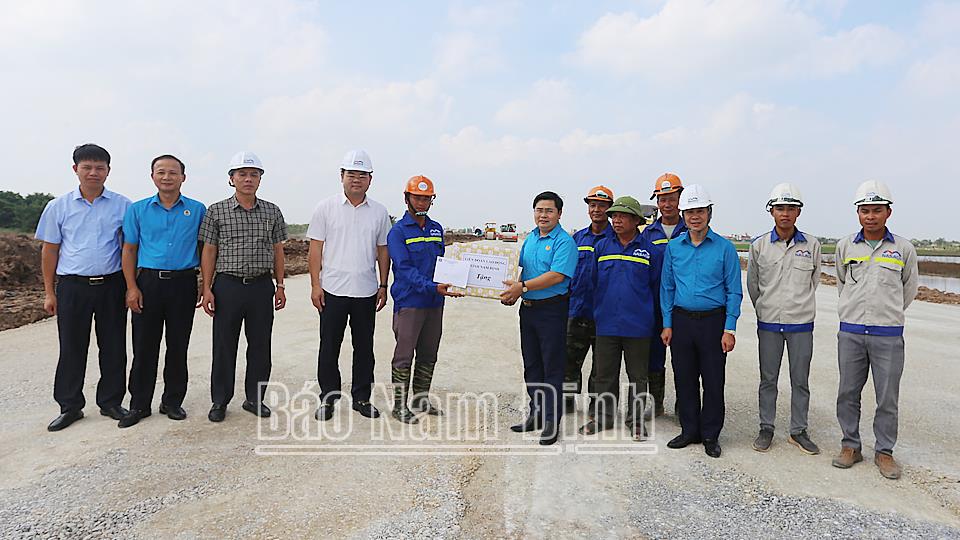 | Lãnh đạo Liên đoàn Lao động tỉnh, Công đoàn ngành Giao thông vận tải và Sở Giao thông vận tải thăm hỏi, tặng quà, động viên cán bộ, kỹ sư, công nhân trên công trình thi công tuyến đường mới Nam Định – Lạc Quần – Đường bộ ven biển. |