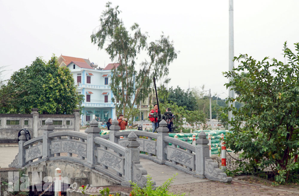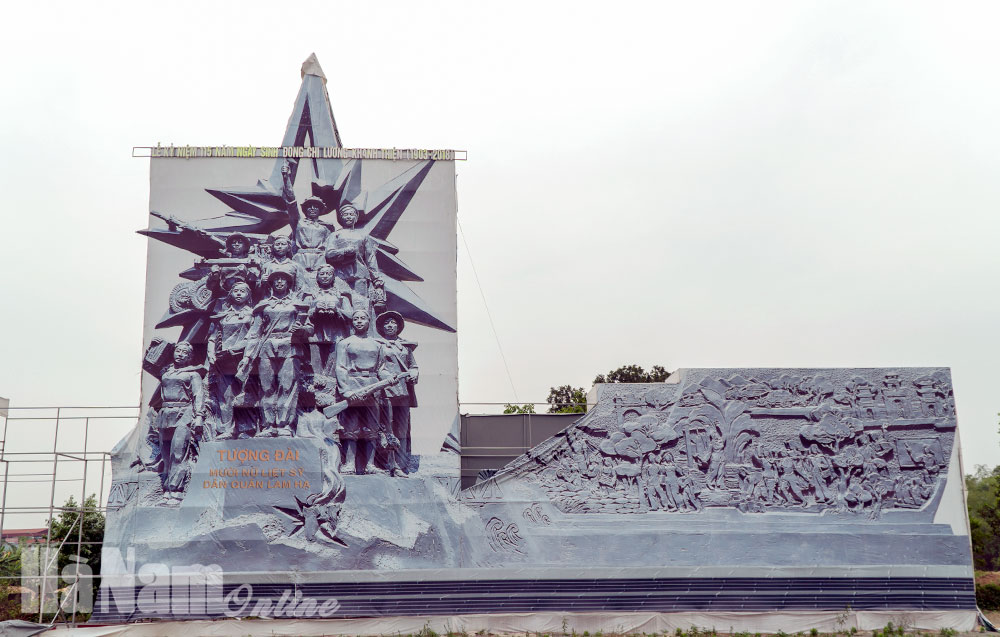Qua chiếc cầu đá, Đền thờ 10 nữ dân quân Lam Hạ nằm trong một vườn cây sum xuê ...Mẫu phác thảo Tượng đài 10 nữ liệt sỹ dân quân Lam Hạ.
