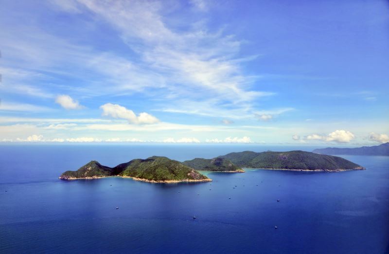 Từ trên cao nhìn xuống, vịnh Bến Đầm tựa bức tranh thủy mặc. Xa xa những ngọn núi xanh thẳm thoai thoải, dưới chân là biển cả bao la, cùng màu xanh ngọc bích. Đây cũng là nơi neo đậu của tàu cá khắp cả nước khi ghé Côn Đảo.