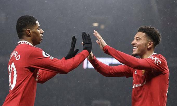 Rashford (trái) mừng bàn 15 ở Ngoại hạng Anh mùa này cùng Jadon Sancho, khi Man Utd gặp Brentford trên sân Old Trafford, ở Ngoại hạng Anh tối 5/4/2023.