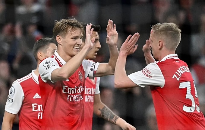 Odegaard mừng bàn thắng cùng Zinchenko (phải).