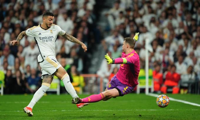Tuy nhiên, ngay cả khi phòng ngự chủ động, Bayern cũng nhiều lần choáng váng bởi sức tấn công của Real. Dù đã cắt cử một cầu thủ giàu kinh nghiệm như Kimmich theo sát Vinicius, họ vẫn bị tiền đạo Brazil nhiều lần vượt qua. Nếu không có Neuer, Bayern có lẽ đã thủng lưới từ sớm. Thủ thành kỳ cựu này đã chạm tay vào bóng, khiến cú sút chéo góc ở đầu trận của Vinicius dội cột dọc, sau đó cản luôn pha sút bồi cự ly gần của Rodrygo.