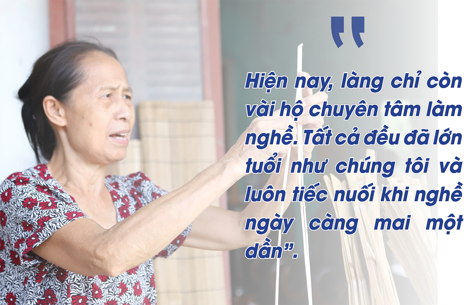 Tuy nhiên, hiện nay, cũng như bao người trẻ khác trong làng, các con ông đều không theo nghề. Một phần do được đi học lên cao và làm đúng chuyên môn, một phần nghề làm mành đã mai một do thị trường không còn ưa chuộng, ngày công thấp hơn so với nghề khác nên chỉ còn ông bà cặm cụi với nghề. Ông Sờn tâm sự: “Lớp trẻ bây giờ không mặn mà với nghề này vì hiện nay giá trị kinh tế không cao, một ngày công thu nhập thấp. Thế hệ chúng tôi không khỏi chạnh lòng khi bao tâm huyết với nghề vẫn muốn gắn bó, gây dựng nhưng trước tác động của cơ chế thị trường đành lực bất tòng tâm. Hiện nay, làng chỉ còn vài hộ chuyên tâm làm nghề. Tất cả đều đã lớn tuổi như chúng tôi và luôn tiếc nuối khi nghề ngày càng mai một dần”.